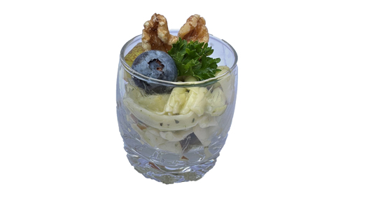 Birnen-Käsesalat an Basilikumsauce im Gläsli angerichtet