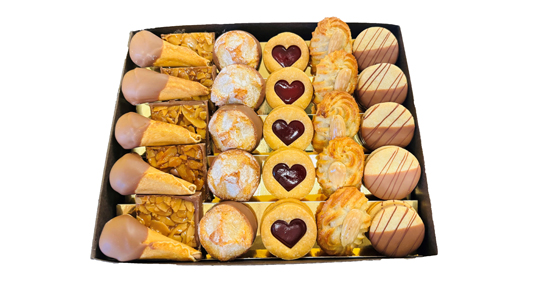 Mürbteigguetzli mit Haselnuss-Mandelgianduja gefüllt und in Couverture trempiert